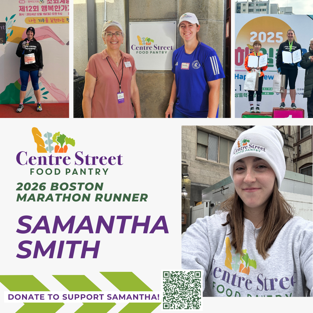 Please join us in supporting Samantha Smith, who will be running the 130th Boston Marathon on Monday April 20 to raise funds and awareness for Centre Street Food Pantry! A Newton native and current Needham resident, Samantha began volunteering at Centre Street last year as (fittingly enough) a runner and outdoor assistant.